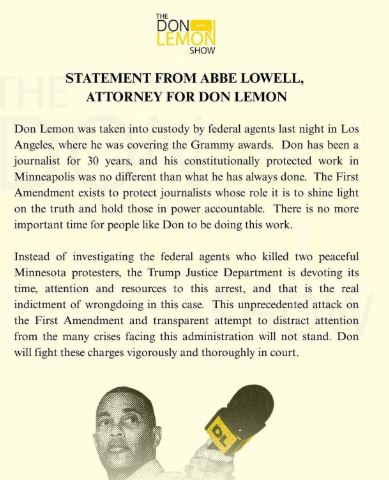 The statement, which was shared on Lemon's Instagram, said, "Don Lemon was taken into custody by federal agents last night in Los Angeles, where he was covering the Grammy awards. Don has been a journalist for 30 years, and his constitutionally protected work in Minneapolis was no different from what he has always done. The First Amendment exists to protect journalists whose role it is to shine light on the truth and hold those in power accountable. There is no more important time for people like Don to be doing this work."