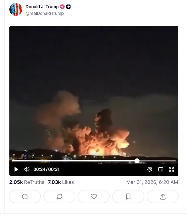 Washington DC [US], March 31 : US President Donald Trump on Monday (local time) shared a video of an explosion on his social media platform Truth Social without providing any context.