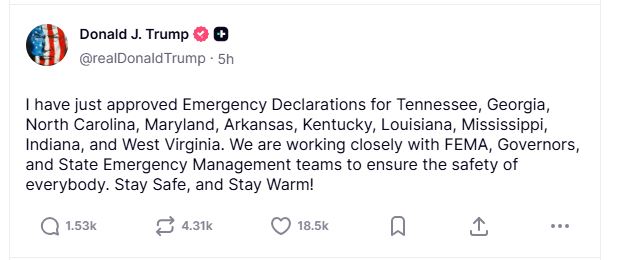 Meanwhile, US President Trump approved emergency declarations for Tennessee, Georgia, North Carolina, Maryland, Arkansas, Kentucky, Louisiana, Mississippi, Indiana, and West Virginia, and said that authorities are working closely with FEMA, Governors, and State Emergency Management teams to ensure the safety of everyone.