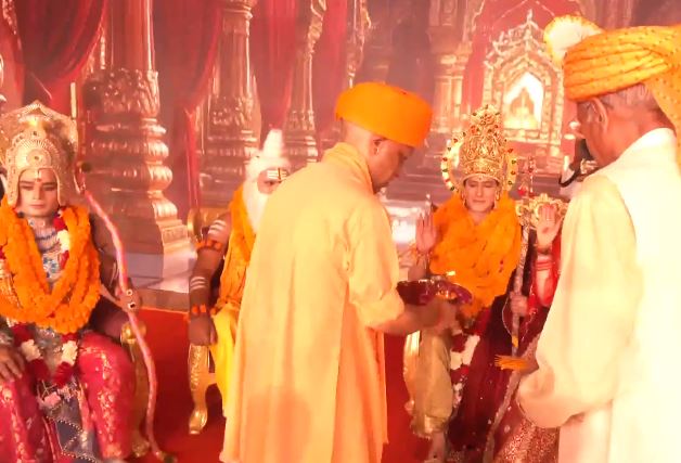 As part of the festivities, the Chief Minister performed the aarti of artists dressed as Lord Ram, Mata Sita, and Lakshman. He also pulled the symbolic chariot, or 'Pushpak Vimaan,' carrying the artists depicting the divine trio.