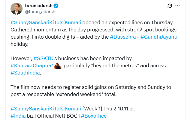 "#SSKTK's business has been impacted by #KantaraChapter1, particularly *beyond the metros* and across #SouthIndia. The film now needs to register solid gains on Saturday and Sunday to post a respectable *extended weekend* total. #SunnySanskariKiTulsiKumari [Week 1] Thu Rs 10.11 cr. #India biz | Official Nett BOC | #Boxoffice," Adarsh noted.