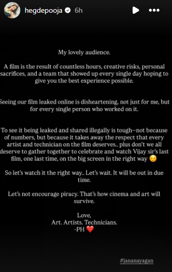 Actor Pooja Hegde, who is a part of the Vijay starrer 'Jana Nayagan', also reacted to the leak and added, "Seeing our film leaked online is disheartening, not just for me, but for every single person who worked on it."