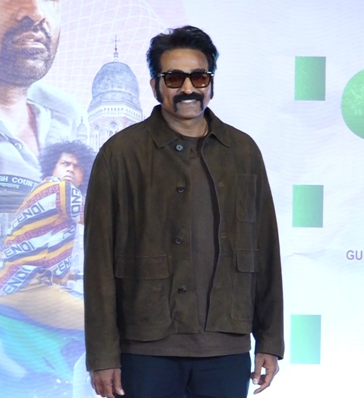 Vijay Sethupathi, who plays the lead role in the film, looked stylish at the event, donning a brown jacket and shirt over blue denim jeans. The actor's moustache and sunglasses served as the highlight of his look.