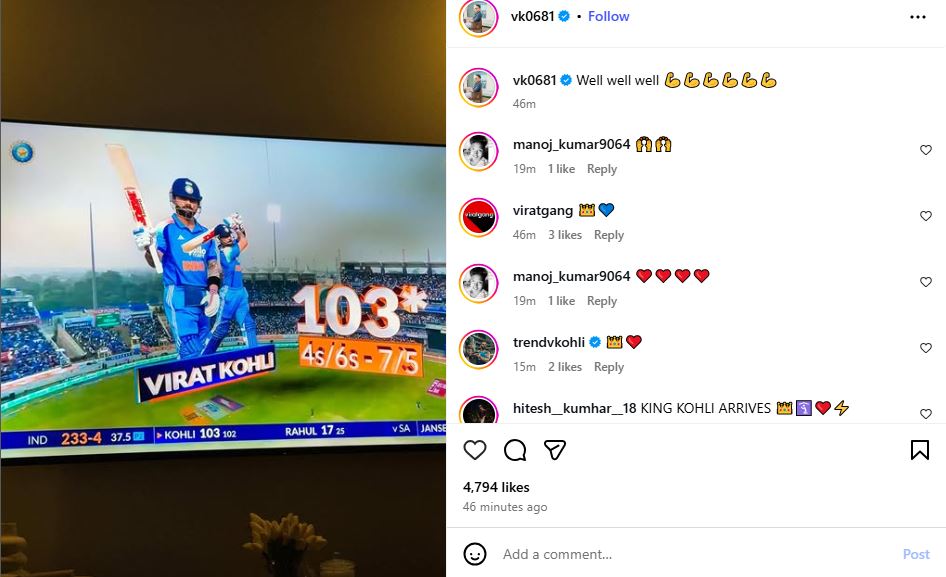 Minutes after Kohli scored 100 during the ongoing ODI match against South Africa at JSCA International Stadium Complex, Ranchi, his elder brother Vikas Kohli and sister Bhawna Kohli Dhingra took to their respective Instagram handles and celebrated their younger brother's remarkable innings.