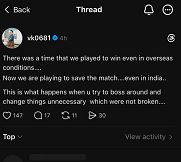 "There was a time that we played to win even in overseas conditions.... Now we are playing to save the match....even in india.. This is what happens when u try to boss around and change things unnecessary which were not broken....," Vikas Kohli wrote in the Threads post, which now appears to be removed.