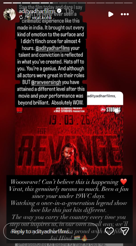 "Watching once-in-a-generation legend show love like this...": Aditya Dhar reacts to Virat Kohli's review for 'Dhurandhar 2'