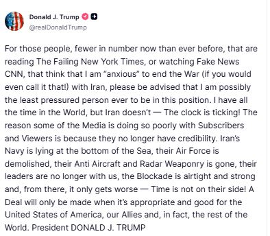 "Iran's Navy is lying at the bottom of the Sea, their Air Force is demolished, their Anti Aircraft and Radar Weaponry is gone, their leaders are no longer with us, the Blockade is airtight and strong and, from there, it only gets worse -- Time is not on their side! A Deal will only be made when it's appropriate and good for the United States of America, our Allies and, in fact, the rest of the World. President DONALD J. TRUMP," the post further read.