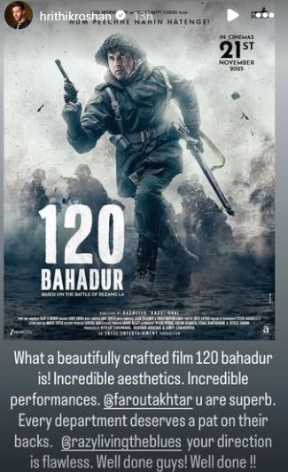 He wrote, "What a beautifully crafted film 120 Bahadur is! Incredible aesthetics. Incredible performances. Farhan Akhtar, u are superb. Every department deserves a pat on their backs. Raznessh Ghai, your direction is flawless. Well done guys! Well done!!"