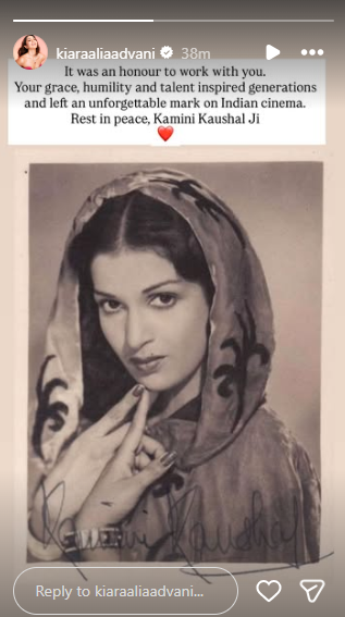 After learning about Kamini Kaushal's demise, Kiara, who worked with her in 'Kabir Singh', took to Instagram and opened up about how the iconic actress inspired generations with her talent.