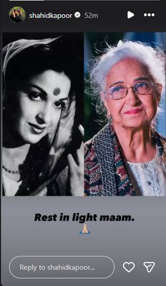 "Rest in light maam," he posted on Instagram story, sharing a picture of Kamini Kaushal from Kabir Singh.