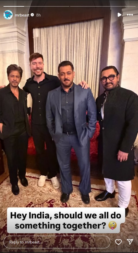 The photo, shared on his Instagram Story, showed the trio dressed dapperly. SRK and Salman looked sharp in formal suits, while Aamir opted for a black kurta paired with white trousers. MrBeast, known for his massive online challenges and giveaways, kept his look simple in an all-black outfit.