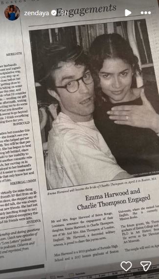 In another post, Zendaya spilt more details about their characters as the engaged couple, Emma Harwood and Charlie Thompson.